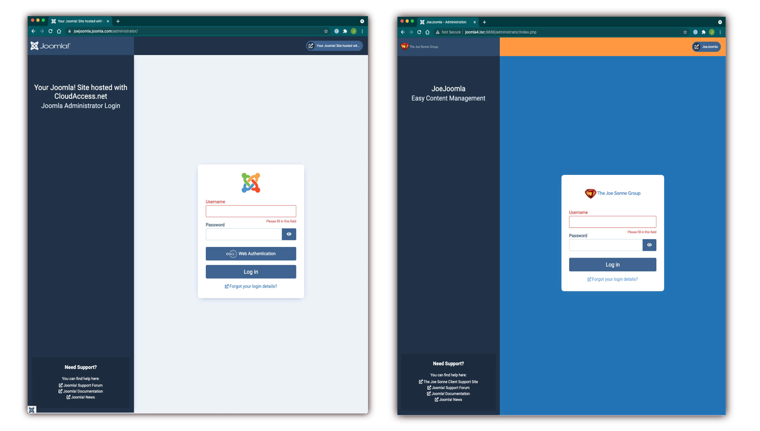 Below are two different backend login screens for Joomla 4. One is the Joomla.com login and the other is customized with The Joe Sonne Group brand colours. There's different messages, colours and logos on these two login screens. The logo image and brand name can be done in the Atum Administrator template Colour and Image Settings. This is found in the System Dashboard of your Joomla 4 admin area. Additional enhancements can be made via CSS in the user.css file of the Atum template. On the left column of the login screen a language override was used for the administrator template. Additional text was added to the bottom left area that says 'Need Support?' I added 'The Joe Sonne Client Support Site' link along with the other links already there using a module override. Even if you don't change the login screen, be sure to customize the admin dashboard to give yourself and your clients a truly customized user experience. This will make publishing content with your Joomla 4 website a joy.